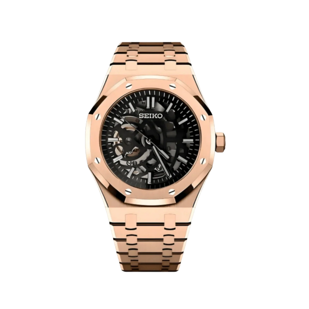 The Seiko Mod Royal Oak brings the unmistakable octagonal bezel and industrial elegance of the original Audemars Piguet Royal Oak into the world of Seiko modding. With brushed steel finishes, exposed screws, and an integrated bracelet look, this mod is a true conversation starter — with the reliable heartbeat of a Seiko NH35 or NH36 movement.