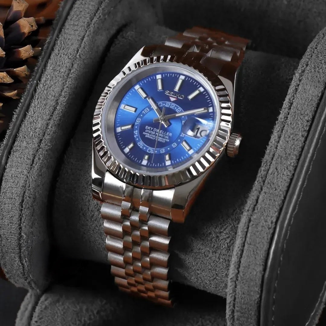 Inspired by the iconic Sky Dweller design, and featuring the prestigious Seiko NH35 automatic movement, we present the Seikjust Sky-Dweller mod. A 36/39 mm high-quality watch combining the perfect alliance between excellence and accessibility.